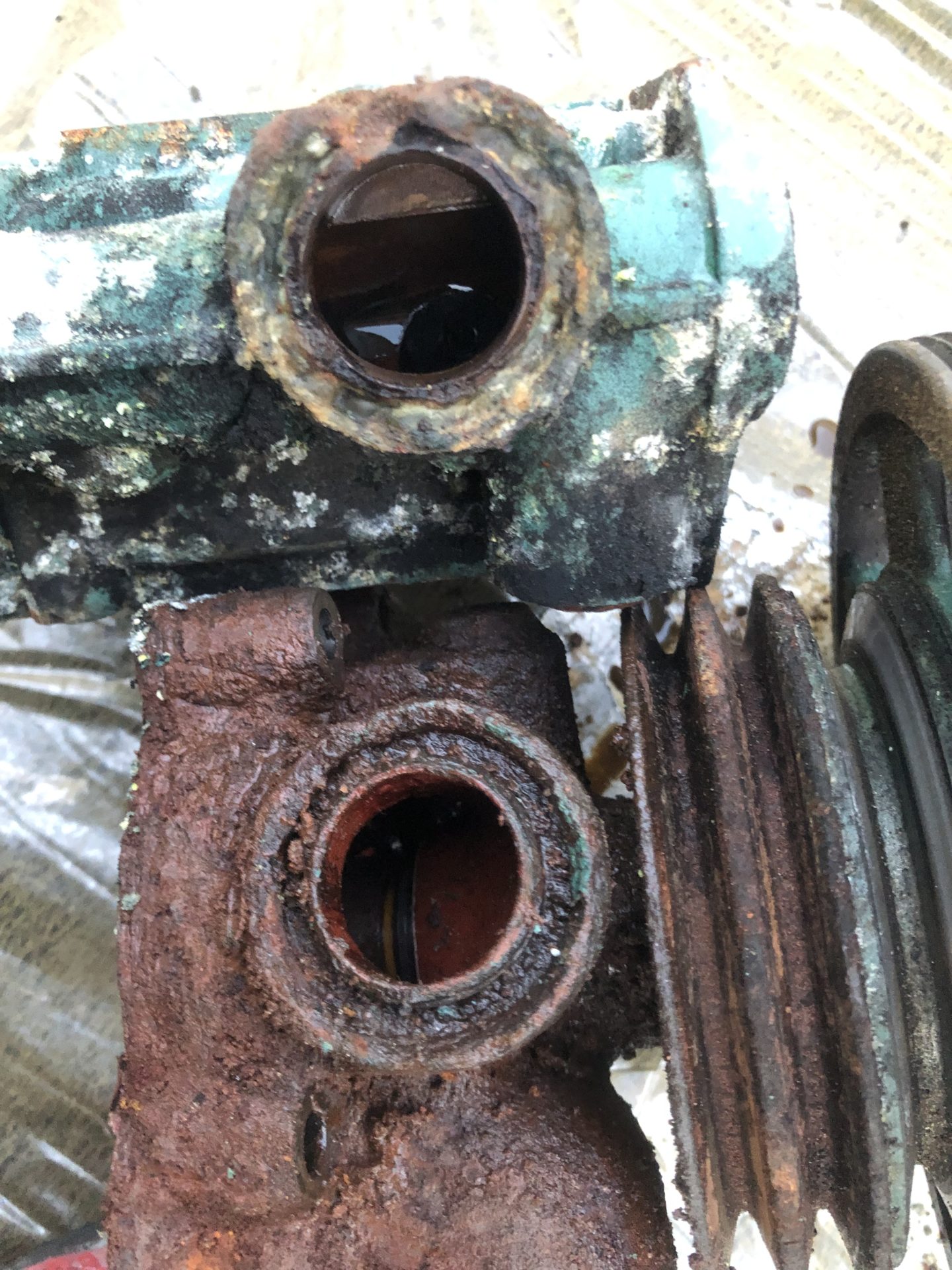 サーキュレーションポンプからの清水漏れです。42Aでも初期型のVベルト2本がけ仕様です。クランク→サーキュレーションポンプ→コンプレッサーが繋がっておりコンプレッサーの負荷がサーキュレーションポンプへもストレスをかけています。サーキュレーションポンプのベアリング交換を含むオーバーホールが必要となります。